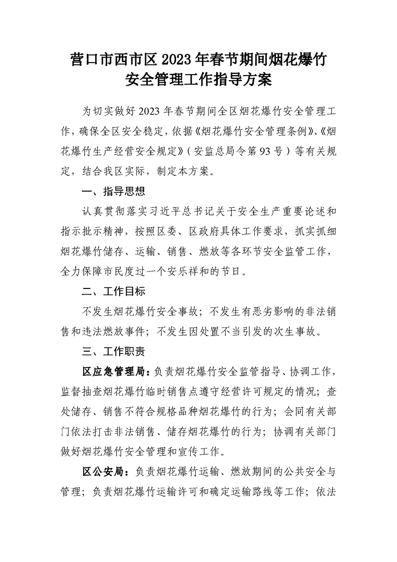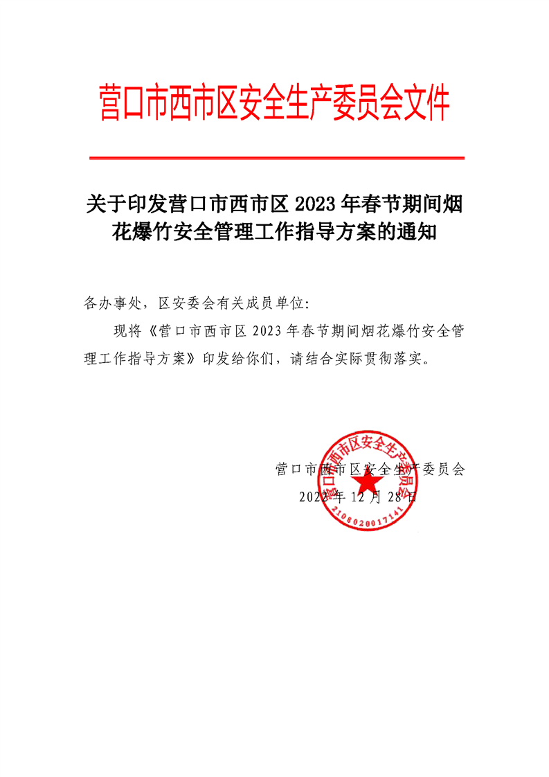 关于印发营口市西市区2023年春节期间烟花爆竹安全管理工作指导方案的通知
