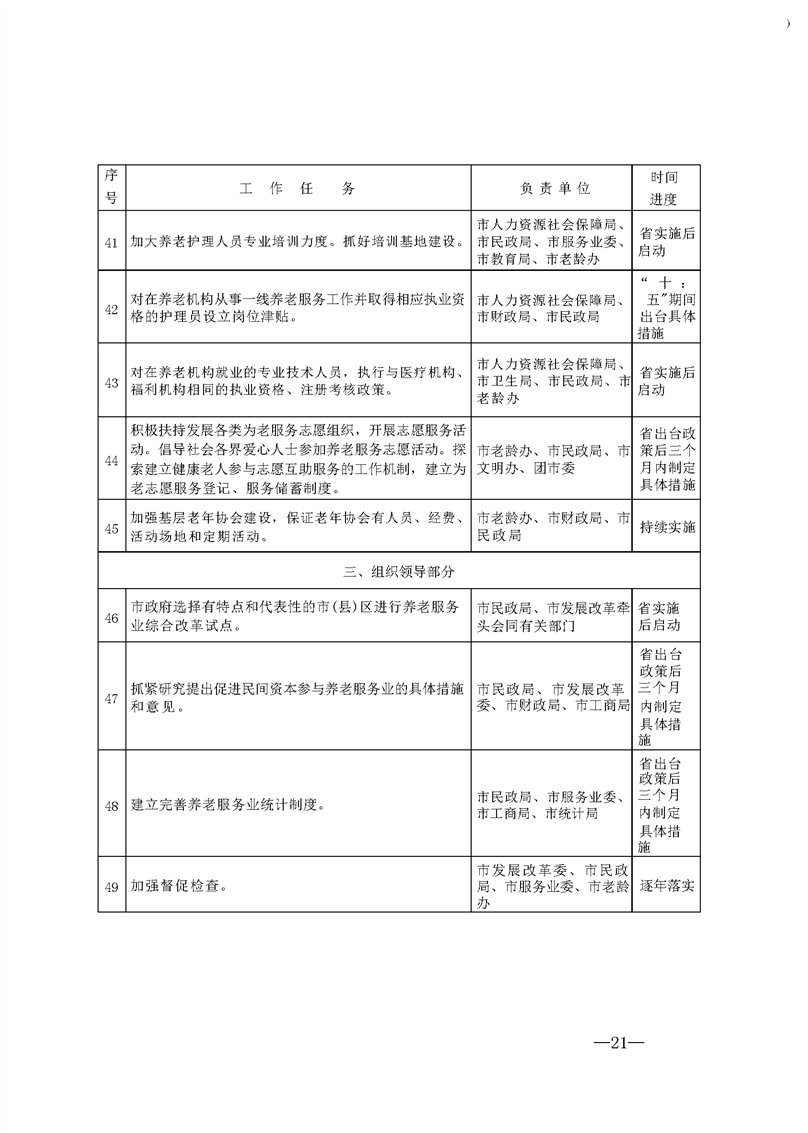 (一)健全工作机制。市政府成立发展养老服务业工作领导小组,负责全市养老服务业工作的组织领导,审定工作计划,统筹协调解决工作中的重大问题,定期分析养老服务业发展新形势和新情况,对我市加快发展养老服务业实施意见执行情况进行监督检查,督促各市(县)区全面完成养老服务业工作发展目标。领导小组办公室负责承担领导小组日常工作和领导小组交办的工作任务,督促协调各成员单位按照各自工作职能做好养老服务业发展工作。各市(县)区要将养老服务业发展纳入经济社会发展规划和政府重要议事日程,列为服务业重点发展领域,制定和组织实施养老服务业发展专项规划。建立完善政府主导、民政牵头、部门配合、社会参与的工作机制。民政、发展改革、财政、老龄工作机构要充分发挥规划建设、综合协调、规范管理和督查指导作用;其他各成员单位要各司其职,及时解决养老服务业发展过程中遇到的问题,落实相关优惠政策,形成齐抓共管、整体推进的工作格局。