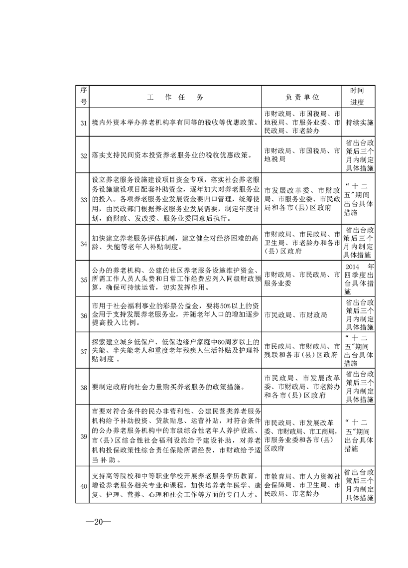 (四)加强督促检查。加强养老服务业发展工作绩效考核。各市(县)区要结合实际抓紧制定具体实施意见。市政府相关部门要根据重点任务分工,结合实际,及时制定具体政策措施。市发展养老服务业工作领导小组要加强对本意见执行情况的监督检查和工作协调,及时向市政府报告工作。