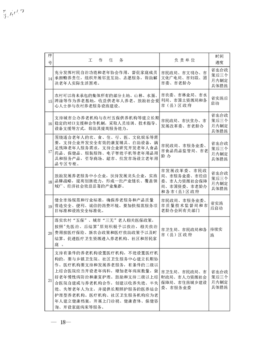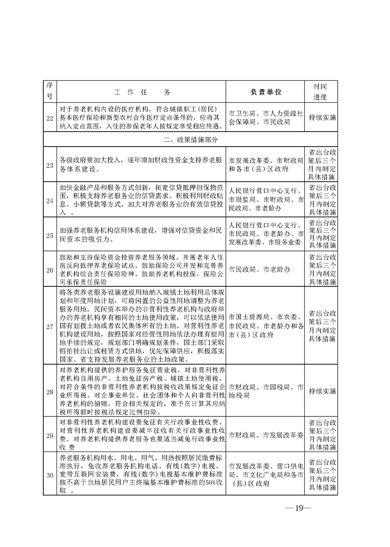 (一)完善投融资政策。各级政府要逐年增加财政性资金,支持养老服务体系建设。完善扶持政策,吸引民间资本投资养老服务机构和企业。金融机构要加快金融产品和服务方式创新,拓宽信贷抵押担保物范围,积极满足养老服务业的信贷需求。积极利用财政贴息、小额贷款等方式,加大对养老服务业的有效信贷投入。加强养老服务机构信用体系建设,增强对信贷资金和民间资本的吸引力。鼓励和支持保险资金投资养老服务领域。开展老年人住房反向抵押养老保险试点。鼓励保险公司开发和完善养老机构综合责任保险险种。鼓励养老机构投保,保险公司承保责任保险。鼓励和支持养老服务龙头企业上市融资。支持符合条件的养老服务企业通过发行公司债、企业债、私募债融资。地方政府发行债券应统筹考虑养老服务需求,积极支持养老服务设施建设及无障碍改造。