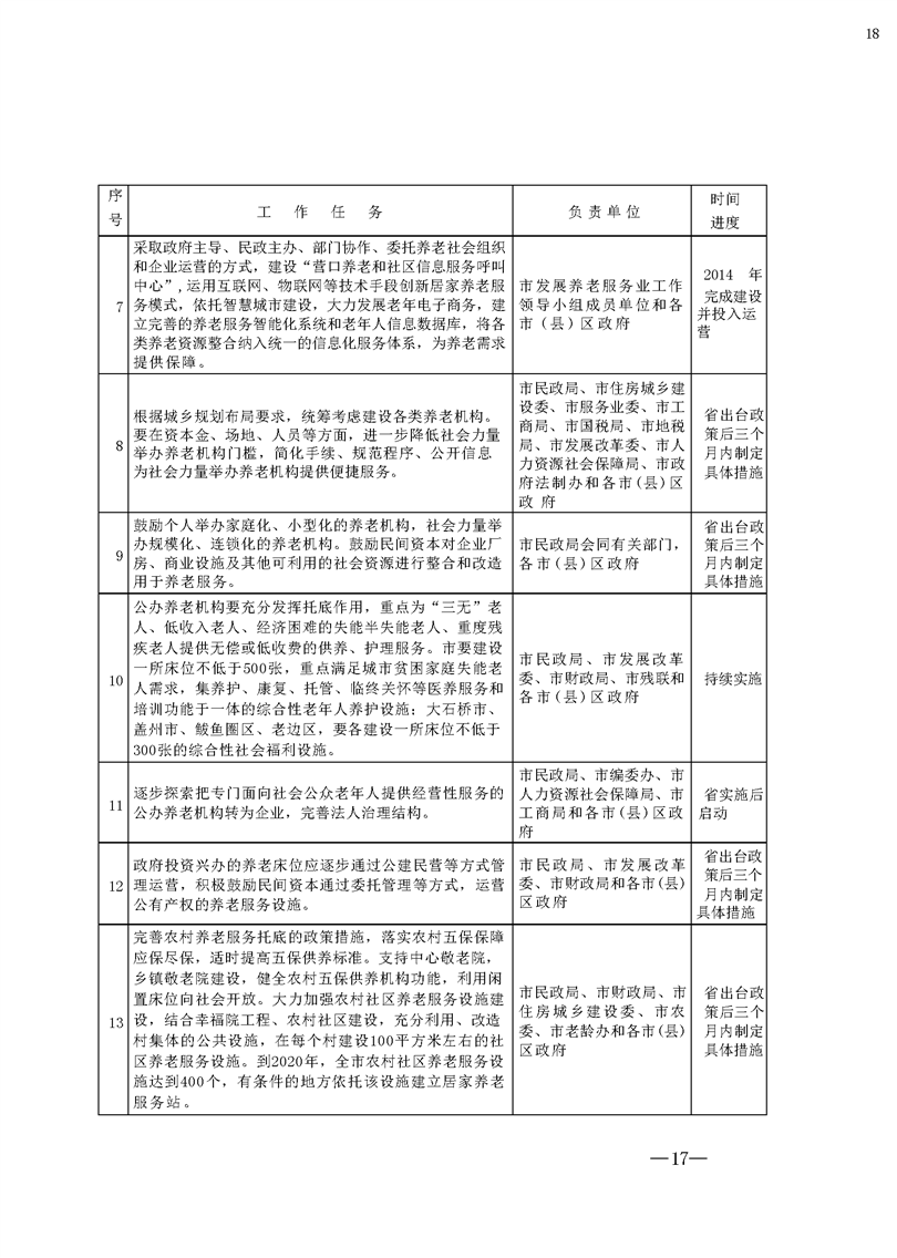 办好公办保障性养老机构。充分发挥公办养老机构托底作用,重点为“三无”(无生活来源、无劳动能力、无赡养人和扶养人、或者其赡养人和扶养人确无赡养和抚养能力)老人、低收入老人、经济困难的失能半失能老人、重度残疾老人提供无偿或低收费的供养、护理服务。充分发挥公办养老机构的引领示范作用。2014年开始,市建设一所床位不低于500张,重点满足城市贫困家庭失能老人需求,集养护、康复、托管、临终关怀等医养服务和培训功能于一体的养老服务中心;大石桥市、盖州市、鲅鱼圈区、老边区,要通过新建、改扩建各建设一所床位不低于300张的综合性社会福利中心。